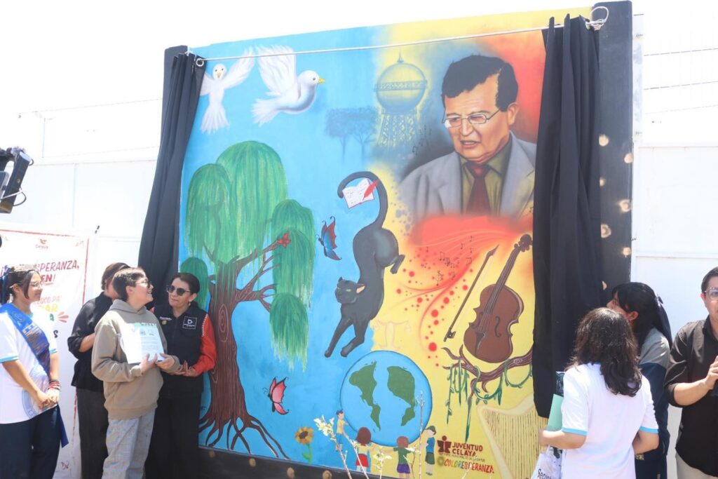 El patio de la escuela secundaria Herminio Martínez fue el punto de reunión para los alumnos, maestros y autoridades que acudieron para la develación de este mural realizado en colaboración con el Instituto Municipal de la Juventud de Celaya.